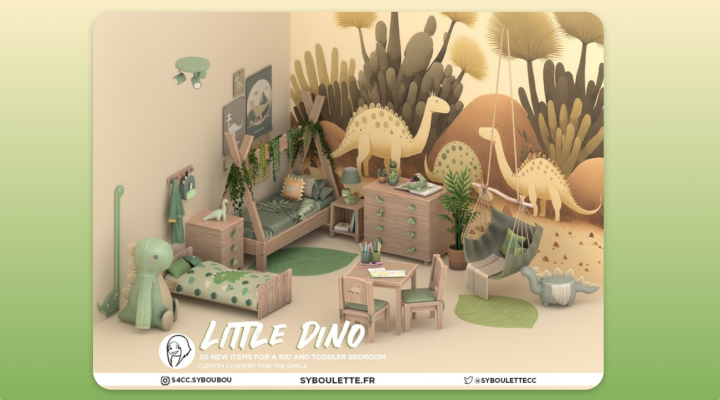 - Функціональність: іграшка "Диплодок", велика плюшева іграшка та плетена корзина (потрібне доповнення "День прання", але також доступна у версії декору для базової гри).