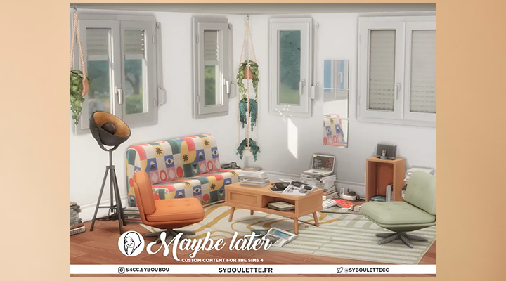 - Декор: навушники, подовжувач з кабелями, стопка паперів, журнали та книжки, квадратні дзеркала, підвісні рослини у горщиках (6 варіантів для коротких, середніх та довгих стін), м'яті килими