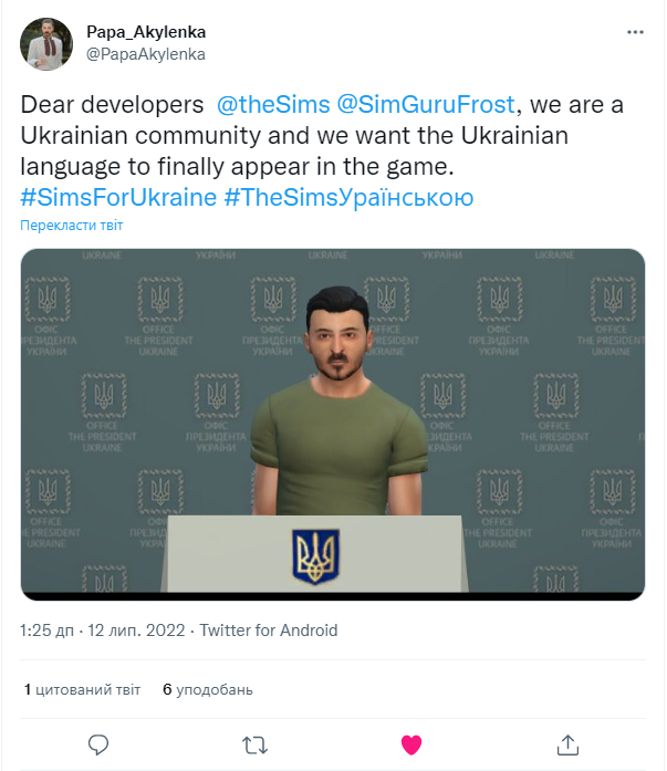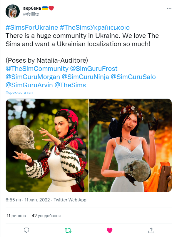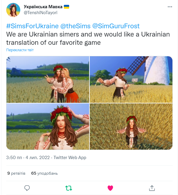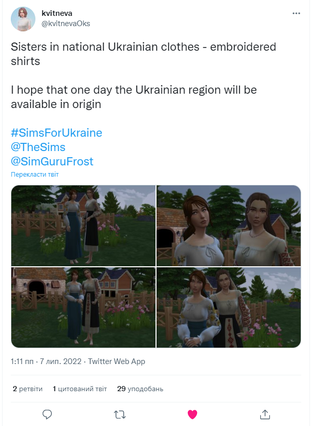 Публікуйте в твітер пости з гештеґом #SimsForUkraine і відмітками @EA @theSims і всіх сім-гуру яких тільки знайдете (їх можна подивитися за посиланням) і вкажіть в пості що ви не згодні з несправедливою політикою EA, яка заставляє нас ділити один регіон з державою-агресором!